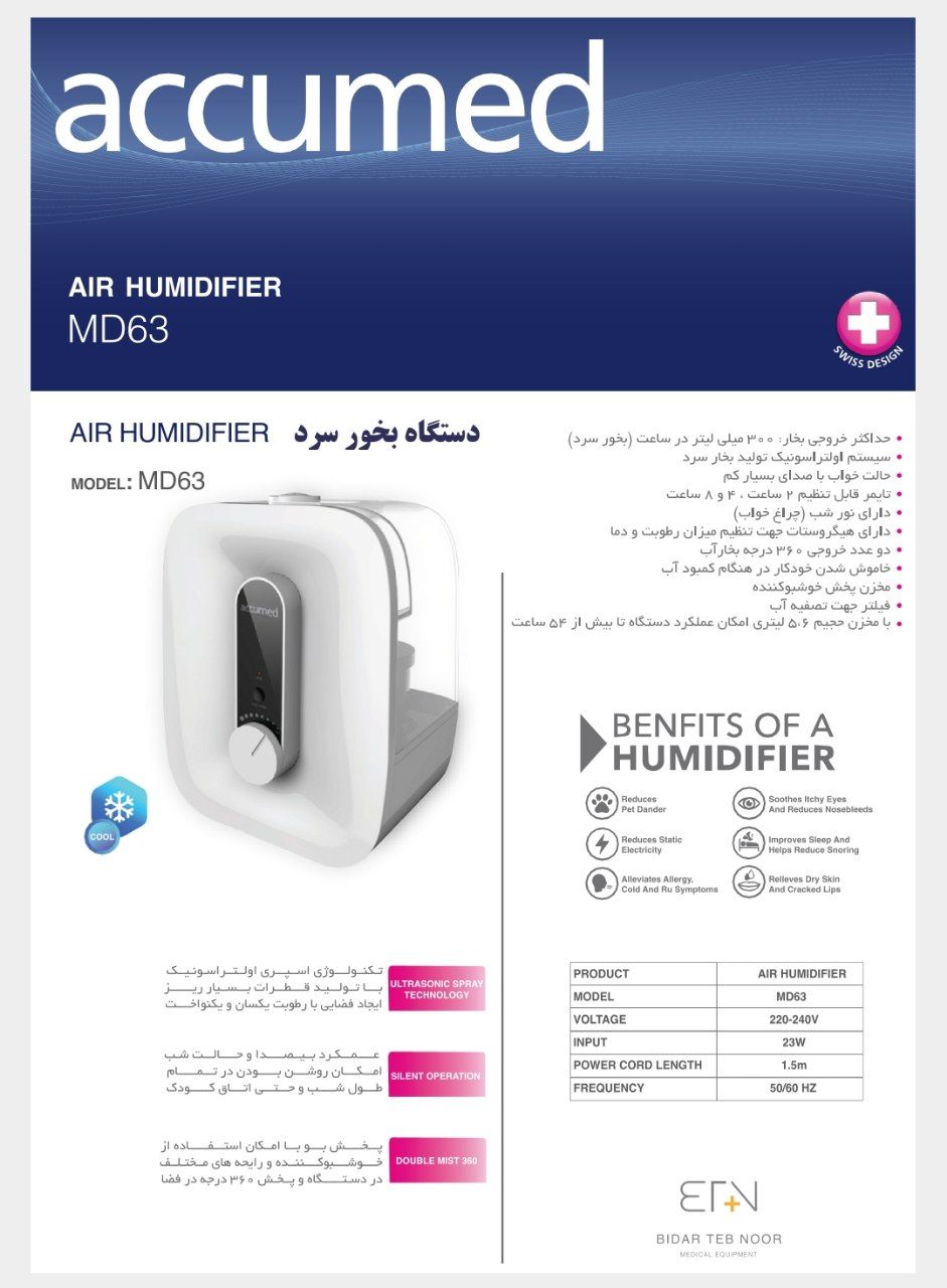 دستگاه بخور سرد اکیومد Accumed مدل MD63 با تکنولوژی اسپری التراسونیک با تولید قطرات بسیار ریز فضایی با رطوبت یکسان و یکنواخت را ایجاد میکند. عملکرد بیصدا و حالت شب و پخش بو با امکان استفاده از خوشبو کننده و رایحه های مختلف در دستگاه و پخش چرخشی 360 درجه در فضا از شاخصه های این دستگاه میباشد..