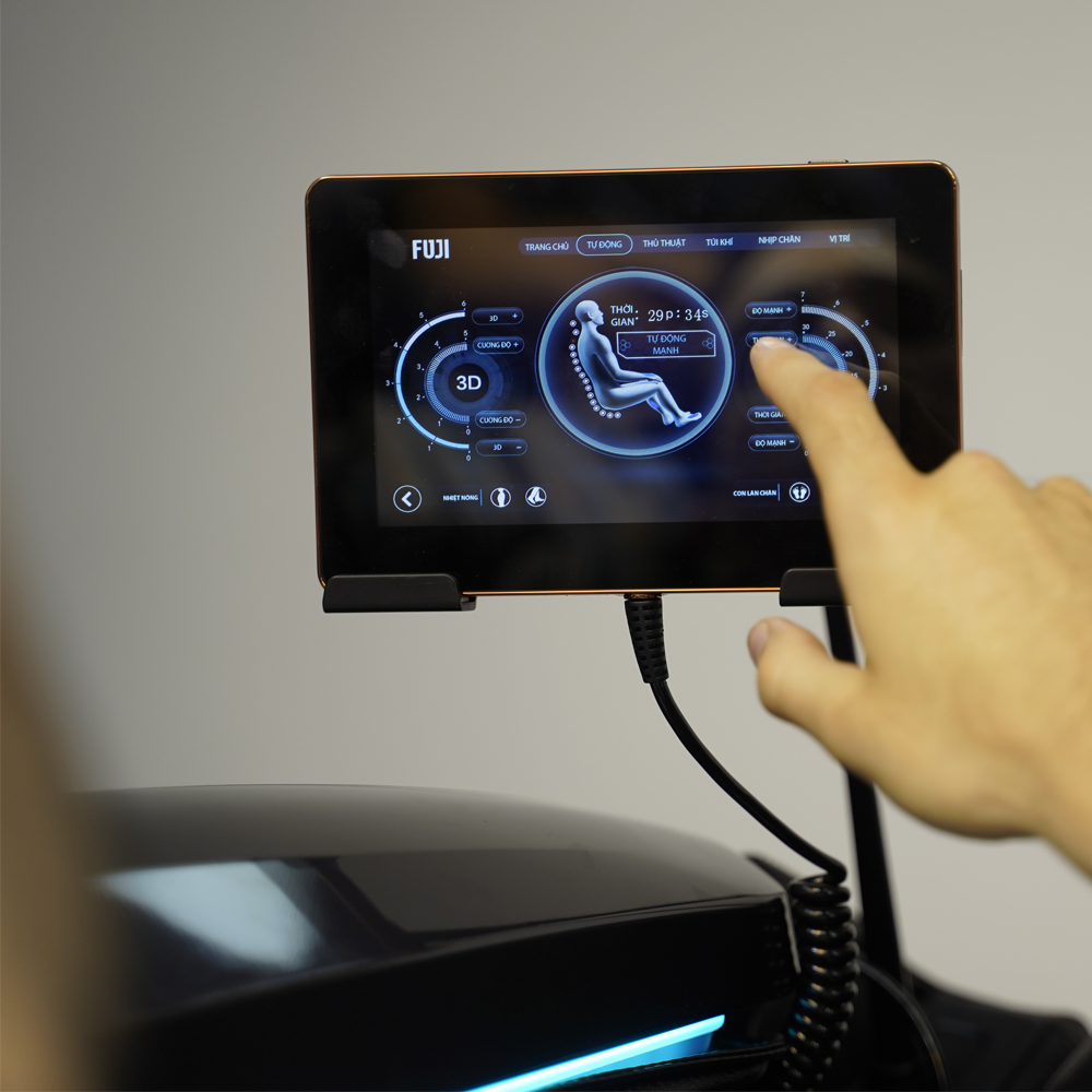 دستگاه دارای یک تبلت بوده که متصل به صندلی است که تمام سیستم صندلی از آن بخش قابل کنترل و تغییر است که در زیر به توضیحات ریز آنها میپردازیم
