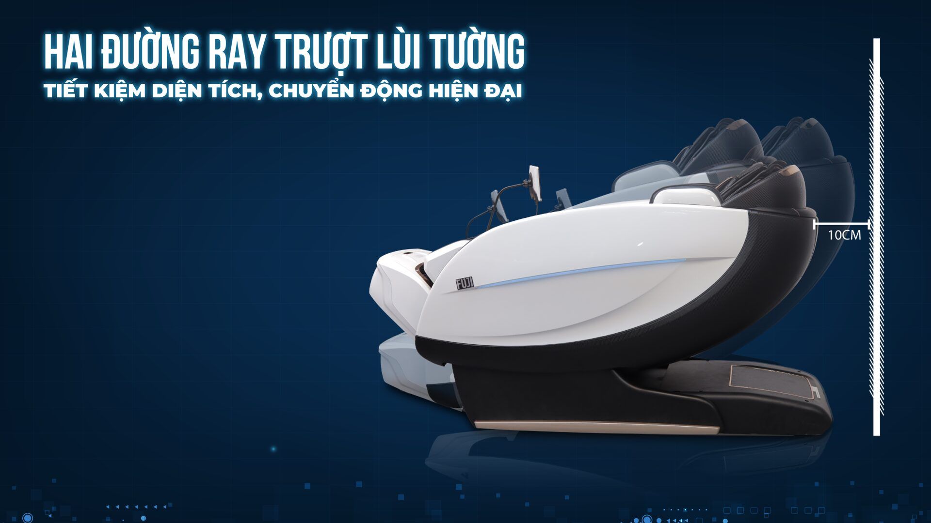 صندلی ماساژ فوجی نیازی به فاصله گرفتن از دیوار ندارد و هنگام روشن شدن ، دستگاه روی ریل حرکت کرده و به جلو حرکت می کند . تا به راحتی فضای مناسب برای جابجایی صندلی حین ماساژ فراهم شود .